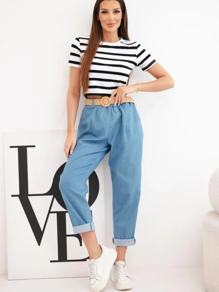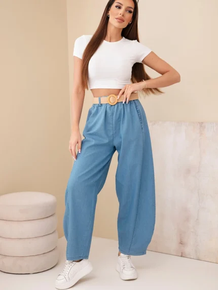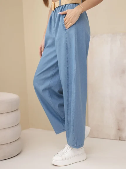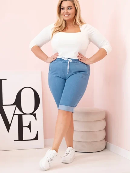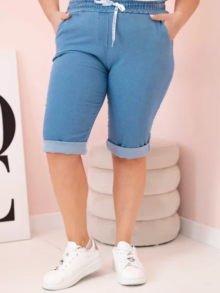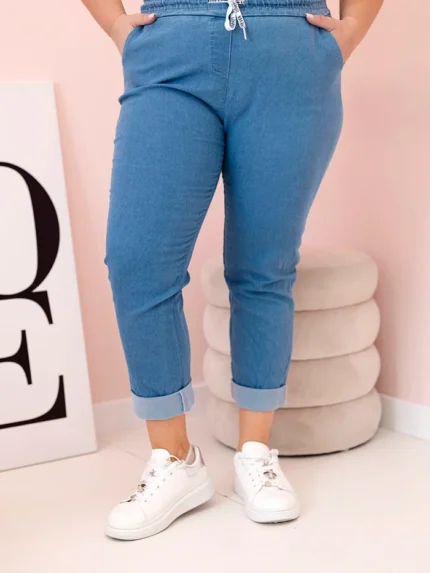 Spodnie damskie bawełniane Plus Size z elastyczną talią i wiązaniem jasno jeansowe