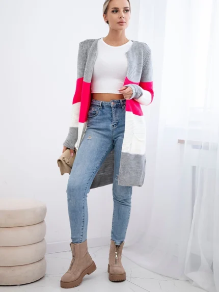 Sweter Kardigan w pasy szary+malinowy