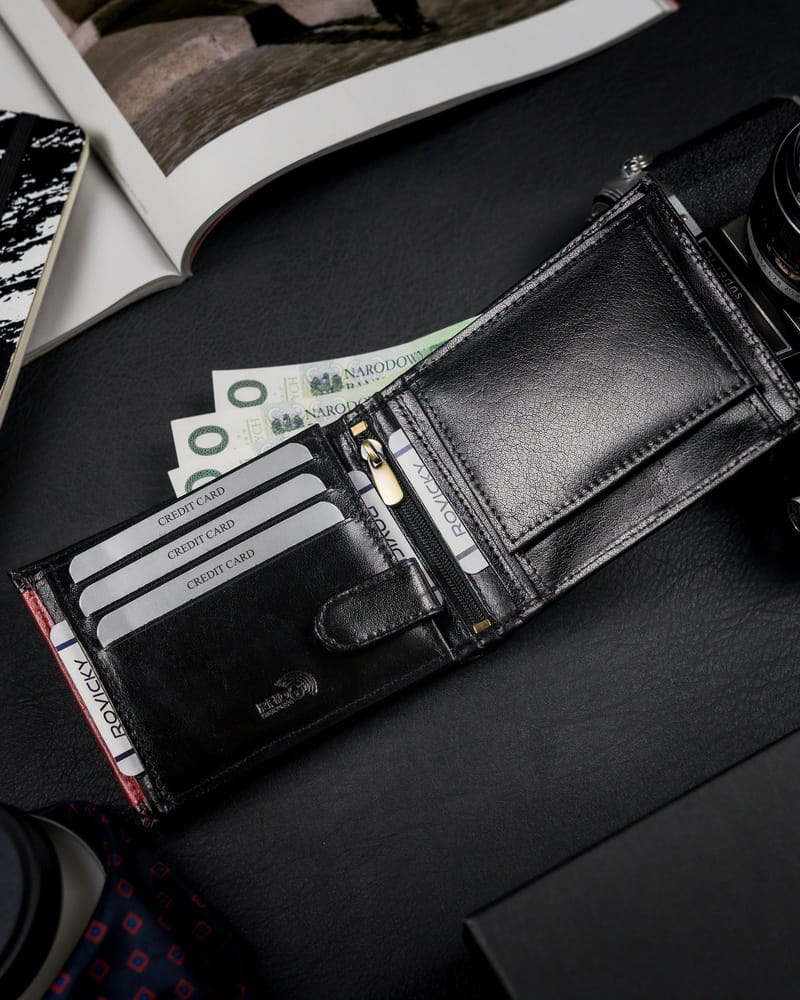 Cienki portfel męski z naturalnej skóry licowej ze schowkiem na suwak — Rovicky