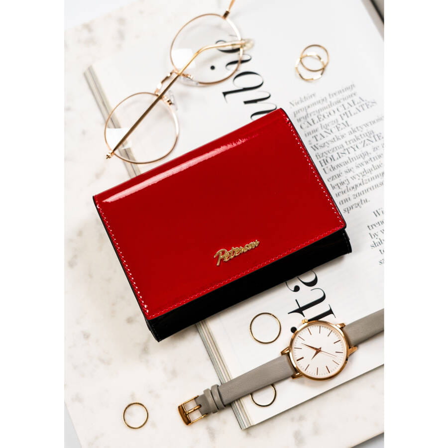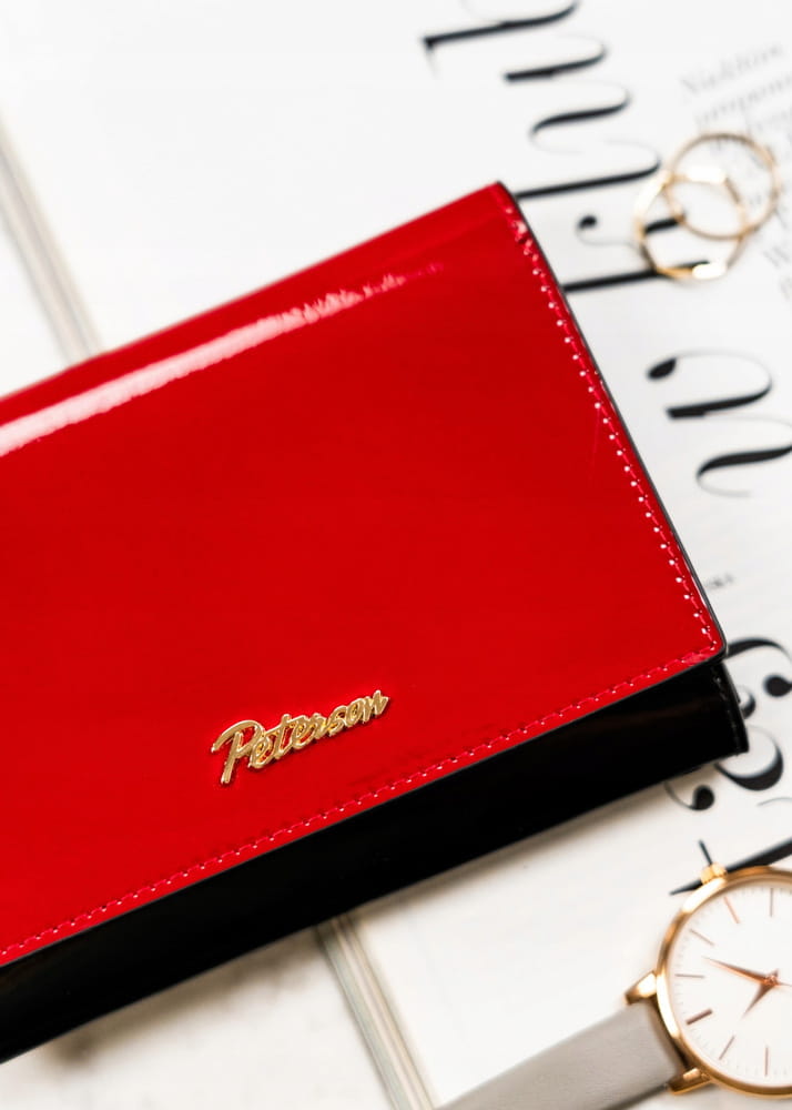 Czerwono-czarny portfel damski z sekcją na bilon zamykaną na bigiel – Peterson