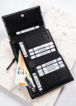 Całość portfela jest zamykana klapką na zatrzask, co daje skuteczną ochronę dla przechowywanych przedmiotów.