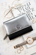 Całość portfela jest zamykana klapką na zatrzask, co daje skuteczną ochronę dla przechowywanych przedmiotów.