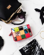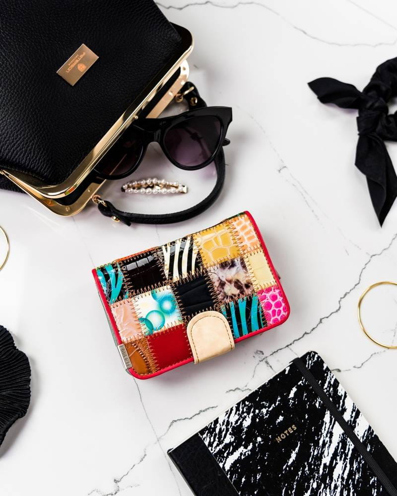 - Patchworkowy wzór | Powierzchnię portfela zdobi patchworkowy wzór. Jest to metoda szycia, w której zszywa się ze sobą kawałki materiału o różnorodnej fakturze i wzorach;