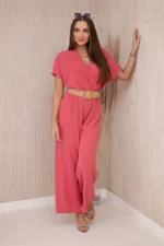 Kombinezon z ozdobnym paskiem w talii koralowy