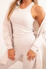 Przedstawiamy Ci nowoczesny i stylowy komplet trzyelementowy, składający się z bluzy na napy, topu oraz legginsów prążkowanych. Ten zestaw doskonale łączy wygodę i modny wygląd, tworząc niezwykle atrakcyjną i funkcjonalną kombinację. Bluza na napy to esencja stylu, wykonana z miękkiego materiału, który zapewnia komfort noszenia. Jej luźny fason pozwala na swobodę ruchów, idealny zarówno do treningu, jak i na co dzień. Top, który znajduje się w tym komplecie, jest idealnym uzupełnieniem dla bluzy. Wykonany z elastycznego materiału, zapewnia doskonałe dopasowanie i podkreśla kobiecą sylwetkę. Jego prążkowany wzór dodaje nuty nowoczesności i stylu. Legginsy prążkowane to doskonały wybór dla aktywnych kobiet. Ich elastyczny materiał gwarantuje pełną swobodę ruchów i wygodę. Prążkowany wzór nadaje im unikalnego wyglądu, wyróżniając się spośród innych typowych legginsów. Ten kompletny zestaw łączy w sobie wygodę, styl i funkcjonalność, tworząc idealną opcję dla tych, którzy cenią sobie modny wygląd bez rezygnacji z komfortu. Bez względu na to, czy zamierzasz go nosić podczas treningu, czy też chcesz wyglądać świetnie na co dzień, ten komplecik z pewnością spełni Twoje oczekiwania i pozwoli Ci poczuć się pewnie i stylowo w każdej sytuacji. Rozmiar jest uniwersalny i będzie odpowiedni dla Pań w rozmiarze S oraz M.