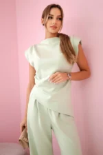 Ten wyjątkowy komplet to idealne połączenie elegancji i komfortu, które podkreśli Twój indywidualny styl. Asymetryczna bluzka zachwyca oryginalnym krojem, nadając stylizacji nowoczesnego charakteru. Jej luźny fason doskonale układa się na sylwetce, maskując ewentualne niedoskonałości i zapewniając swobodę ruchów. Spodnie, idealnie dopasowane do bluzki, posiadają wygodny krój, który gwarantuje komfort noszenia przez cały dzień. Wykonane z wysokiej jakości materiałów, świetnie układają się na ciele i pasują zarówno do codziennych, jak i bardziej eleganckich stylizacji. Komplet asymetryczna bluzka + spodnie to doskonały wybór dla kobiet, które cenią sobie niebanalne fasony i chcą wyglądać stylowo w każdej sytuacji. Idealny zarówno do pracy, na spotkania, jak i na wyjątkowe okazje – stwórz niepowtarzalny look, który wyróżni Cię z tłumu. Rozmiar jest uniwersalny i pasuje dla kobiet noszących rozmiar S, M lub L.