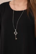 Komplet włoski dwuczęściowy składający się z rozkloszowanej bluzki oraz spodni to elegancki zestaw, który dodaje uroku i stylu każdej stylizacji. Bluzka o rozkloszowanym kroju nadaje subtelnej kobiecości, podkreślając figurę, a jednocześnie zapewniając swobodę ruchów. Klasyczny fason spodni sprawia, że doskonale komponują się z elegancką bluzką, tworząc spójną i stylową całość. Dodatkowo, wisiorek w kształcie klucza stanowi uroczy detal, który dodaje oryginalności i charakteru temu zestawowi, tworząc harmonijną kompozycję. To elegancki dodatek, który podkreśla wyjątkowość i dbałość o detale w całej stylizacji. Taki komplet włoski doskonale nadaje się na wiele okazji, od spotkań biznesowych po romantyczne randki. Jest to wyrafinowana opcja dla osób ceniących sobie elegancję i wygodę w jednym. Rozmiar jest uniwersalny i pasuje dla kobiet noszących rozmiar S, M lub L.