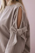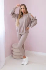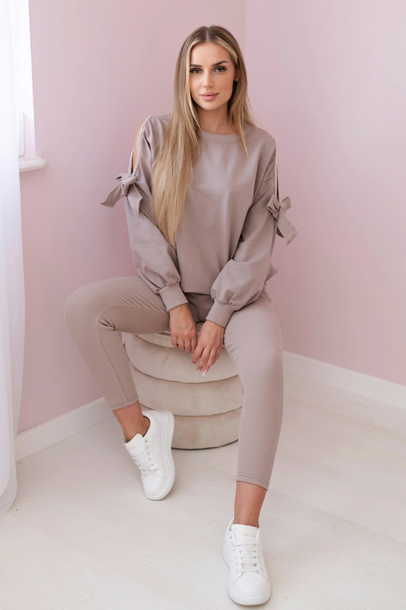 Komplet bluzy z kokardą na rękawach i legginsów to urocza i stylowa propozycja dla kobiet ceniących sobie wygodę i modny wygląd. Bluza z kokardami na rękawach dodaje zestawowi subtelności i dziewczęcego uroku, nadając mu wyjątkowego charakteru. Wykonana z miękkiego i przyjemnego w dotyku materiału, bluza zapewnia komfort noszenia przez cały dzień, jednocześnie prezentując się elegancko i stylowo. Kokardy na rękawach stanowią ciekawy detal, który wyróżnia ten komplet spośród innych. Legginsy, będące częścią tego zestawu, zapewniają wygodę i swobodę ruchów, idealnie dopasowując się do sylwetki. Dzięki elastycznemu materiałowi, legginsy doskonale przylegają do ciała, podkreślając kobiece kształty. Komplet bluzy z kokardą na rękawach i legginsów to doskonały wybór na wiele okazji, zarówno na relaksujące wieczory w domu, jak i na niezobowiązujące spotkania ze znajomymi czy spacer na świeżym powietrzu. Dzięki swojemu uroczemu designowi i wysokiej jakości wykonania, ten komplet będzie niezastąpionym elementem Twojej garderoby, dodając uroku i wygody każdej stylizacji. Rozmiar jest uniwersalny i będzie odpowiedni dla Pań noszących rozmiar S, M lub L.