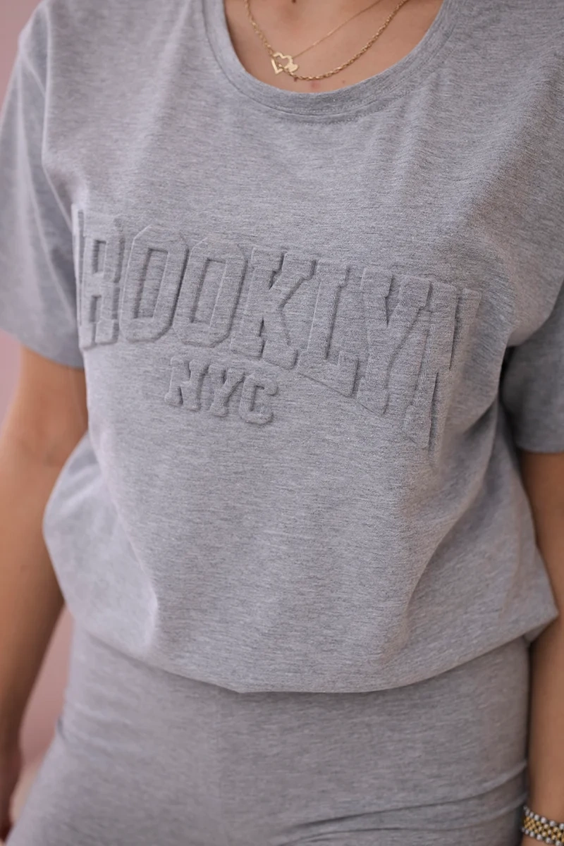 Prezentujemy Państwu komplet bluzki i spodenek. Bluzka z wytłoczonym napisałem Brooklyn. Legginsy posiadają krótką nogawkę. Komplet wykonany jest z wysokiej jakości materiału. Rozmiar jest uniwersalny i będzie odpowiedni dla Pań noszących rozmiar S, M lub L.