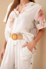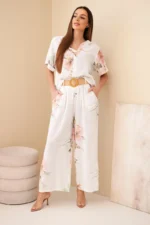 Bluzka posiada klasyczny, lekko luźny krój z krótkim rękawem oraz dekoracyjne zapięcie na guzik przy dekolcie, co nadaje jej subtelnej elegancji. Spodnie wyposażone są w elastyczny pas, dzięki czemu idealnie dopasowują się do sylwetki i zapewniają wygodę przez cały dzień. Dodatkowym atutem jest pasek, który pięknie podkreśla talię i nadaje stylizacji wyjątkowego charakteru.