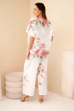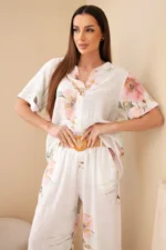 Komplet damski bawełniany z krótkim rękawem i szeroką nogawką to stylowa i niezwykle wygodna propozycja na cieplejsze dni. Zestaw składa się z lekkiej bluzki z krótkim rękawem oraz luźnych spodni z szeroką nogawką, które razem tworzą modną i bardzo kobiecą stylizację. Naturalny materiał sprawia, że komplet jest przewiewny i komfortowy w noszeniu nawet podczas gorących dni.