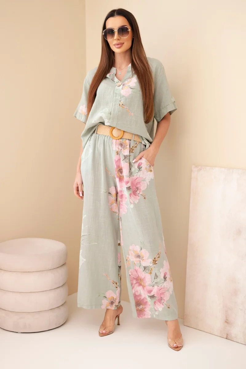 Komplet damski bawełniany z krótkim rękawem i szeroką nogawką khaki