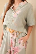 Bluzka posiada klasyczny, lekko luźny krój z krótkim rękawem oraz dekoracyjne zapięcie na guzik przy dekolcie, co nadaje jej subtelnej elegancji. Spodnie wyposażone są w elastyczny pas, dzięki czemu idealnie dopasowują się do sylwetki i zapewniają wygodę przez cały dzień. Dodatkowym atutem jest pasek, który pięknie podkreśla talię i nadaje stylizacji wyjątkowego charakteru.