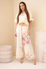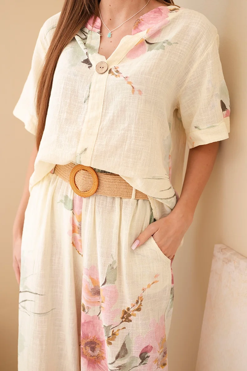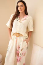 Bluzka posiada klasyczny, lekko luźny krój z krótkim rękawem oraz dekoracyjne zapięcie na guzik przy dekolcie, co nadaje jej subtelnej elegancji. Spodnie wyposażone są w elastyczny pas, dzięki czemu idealnie dopasowują się do sylwetki i zapewniają wygodę przez cały dzień. Dodatkowym atutem jest pasek, który pięknie podkreśla talię i nadaje stylizacji wyjątkowego charakteru.