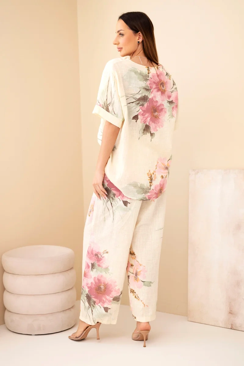 Komplet damski bawełniany z krótkim rękawem i szeroką nogawką to stylowa i niezwykle wygodna propozycja na cieplejsze dni. Zestaw składa się z lekkiej bluzki z krótkim rękawem oraz luźnych spodni z szeroką nogawką, które razem tworzą modną i bardzo kobiecą stylizację. Naturalny materiał sprawia, że komplet jest przewiewny i komfortowy w noszeniu nawet podczas gorących dni.