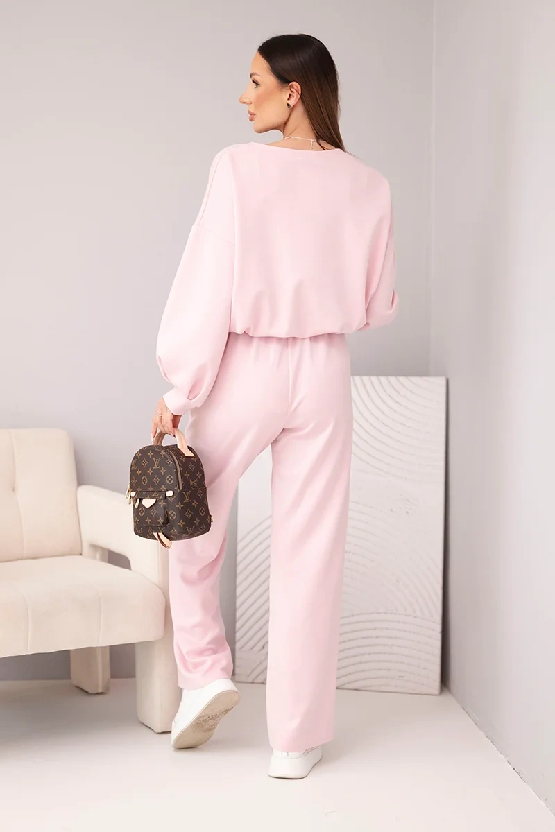 Fason: luźna bluza z gumką w pasie + spodnie z prostą nogawką
