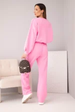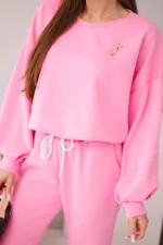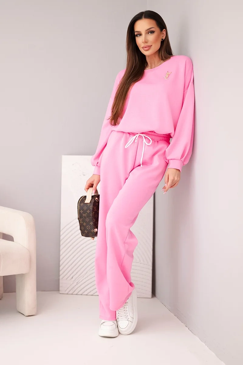 Komplet damski masełko bluza z broszką i spodnie z prostą nogawką jasno różowy
