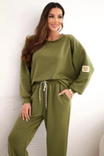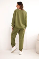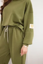 Elegancki zestaw damski stworzony z miękkiej, elastycznej wiskozy z dodatkiem poliestru i elastanu to doskonały wybór dla kobiet, które cenią sobie komfort i stylowy wygląd. Bluza o luźnym kroju z wydłużonym tyłem i obniżoną linią ramion została wzbogacona uroczym detalem LOVE na rękawach, co nadaje jej niepowtarzalnego charakteru. Spodnie z elastycznym pasem i troczkiem idealnie dopasowują się do sylwetki, a ściągacze przy nogawkach dodają sportowej lekkości.