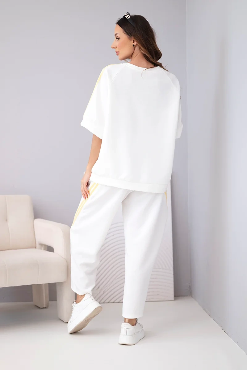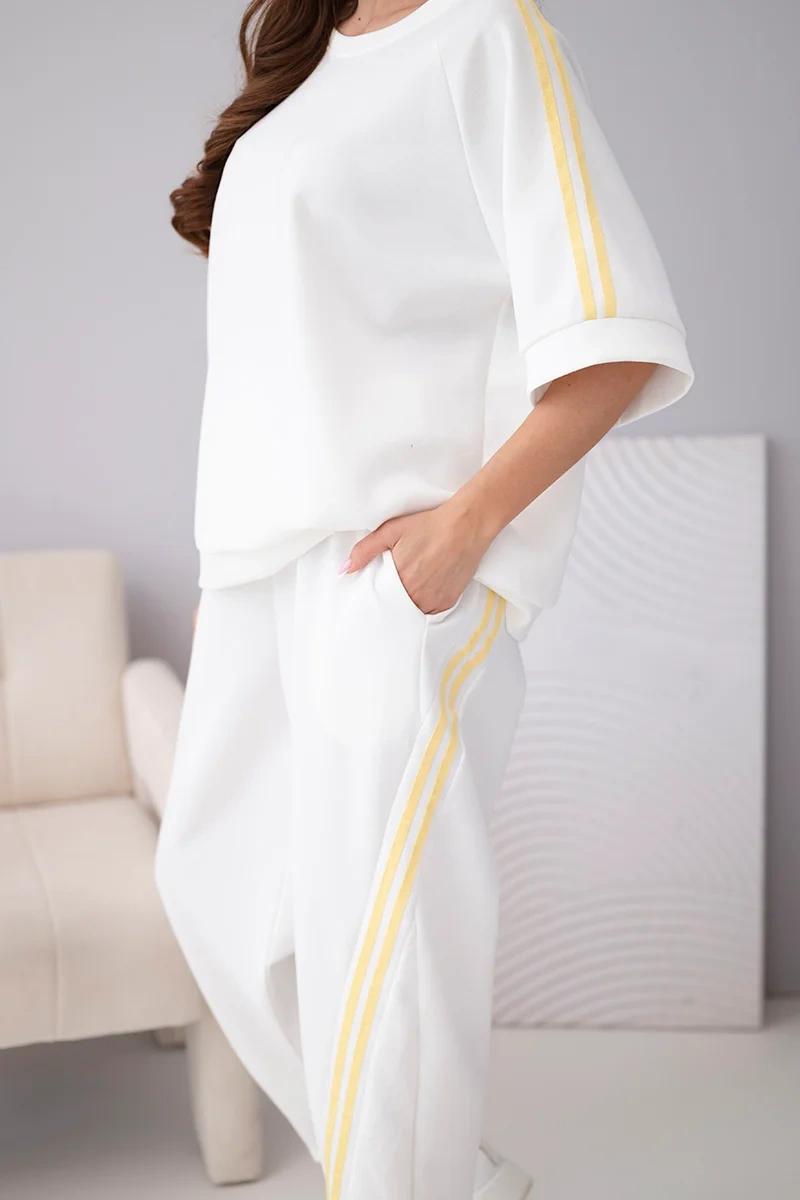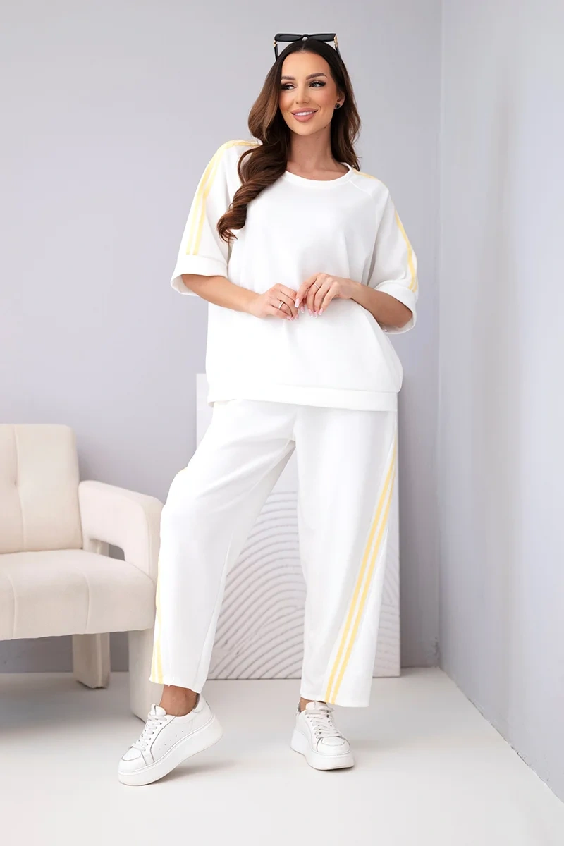 Bluza o swobodnym kroju posiada rękawy z ozdobnymi lampasami, które nadają całości nowoczesnego charakteru. Spodnie z elastyczną talią i bocznymi lampasami optycznie wysmuklają nogi. Komplet świetnie sprawdzi się na co dzień, na spacer, zakupy czy w podróży.