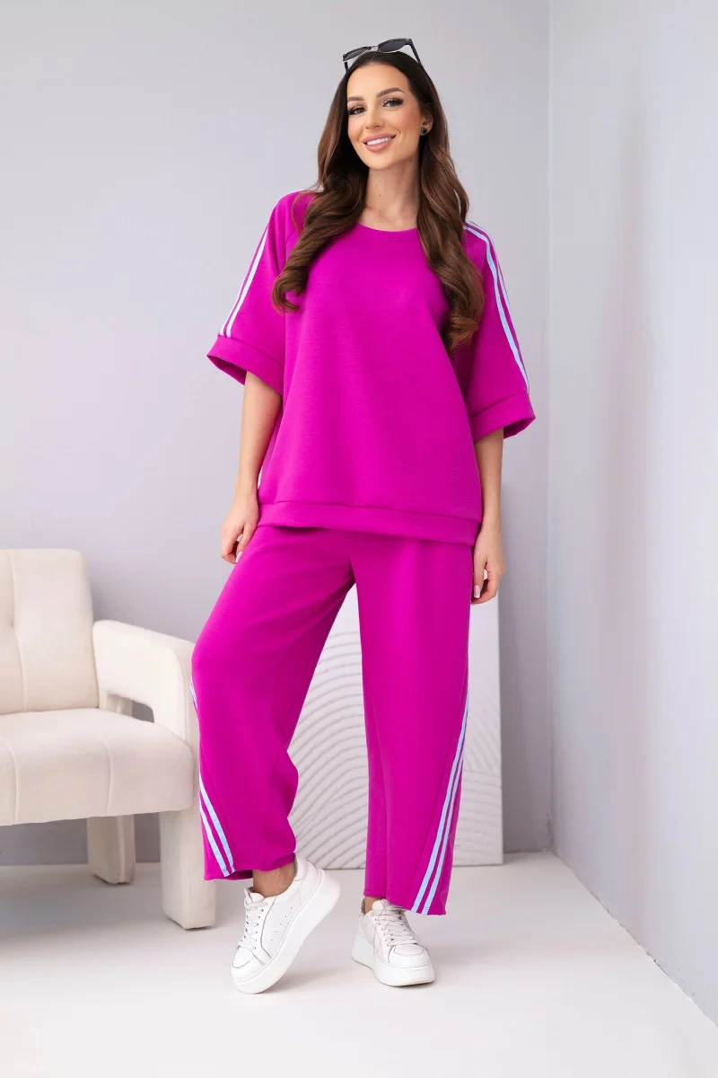 Bluza o swobodnym kroju posiada rękawy z ozdobnymi lampasami, które nadają całości nowoczesnego charakteru. Spodnie z elastyczną talią i bocznymi lampasami optycznie wysmuklają nogi. Komplet świetnie sprawdzi się na co dzień, na spacer, zakupy czy w podróży.