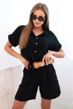 - Fason: koszula z krótkim rękawem i wiązaniem, luźne szorty z elastycznym pasem