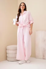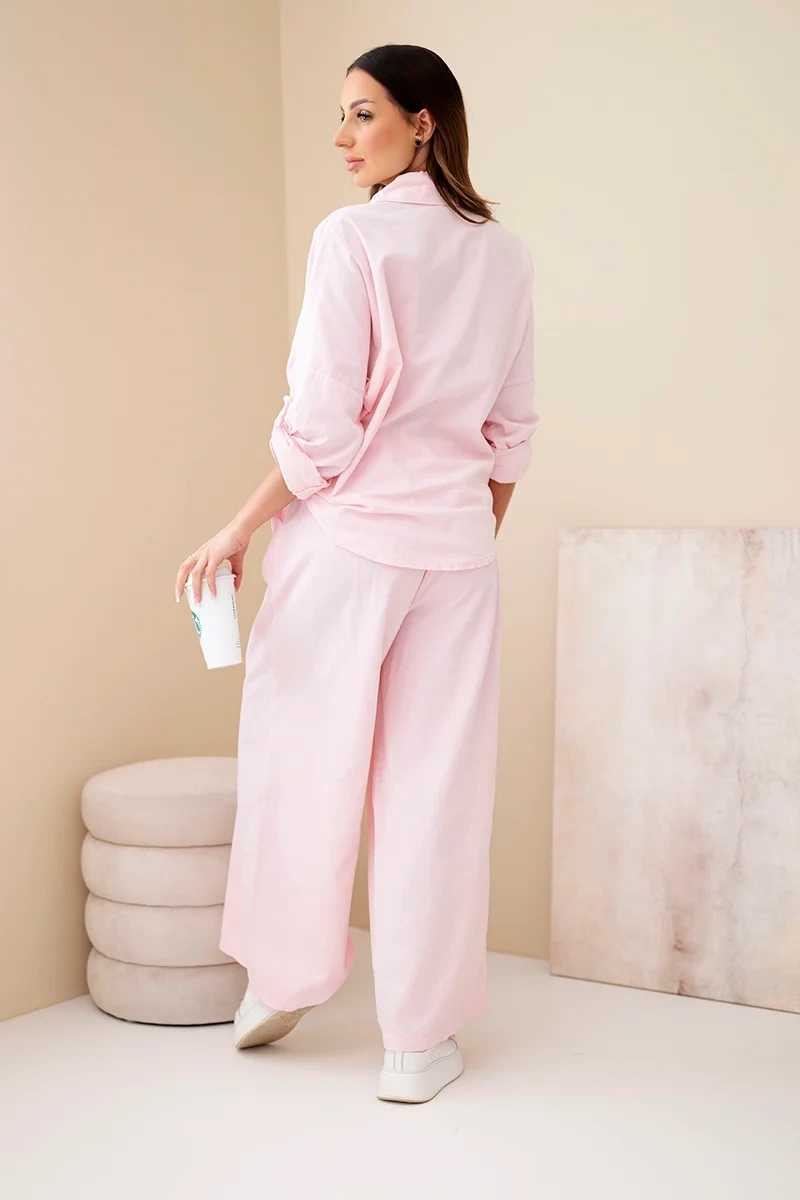Komplet damski sztruksowy z wiązaną koszulą i szerokimi nogawkami pudrowy róż