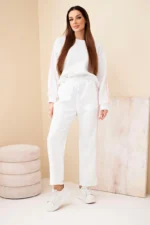 Bluza damska o prostym, oversize’owym kroju zapewnia komfort noszenia i swobodę ruchów. Spodnie damskie z szeroką nogawką oraz wiązaniem w pasie świetnie dopasowują się do sylwetki, podkreślając jej atuty. Boczne lampasy nadają całości sportowego, nowoczesnego charakteru, dzięki czemu komplet dresowy damski doskonale wpisuje się w aktualne trendy.
