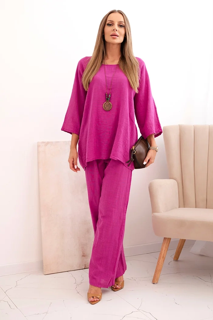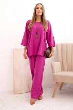 Stylowy komplet damski składający się z lekkiej bluzki z rękawem 3/4 oraz szerokich spodni z wiązaniem w pasie, który doskonale sprawdzi się na co dzień i w casualowych stylizacjach. Bluzka ozdobiona jest eleganckim naszyjnikiem, który dodaje całości wyjątkowego charakteru i podkreśla naturalny, subtelny styl. Wykonana z miękkiej wiskozy, zapewnia komfort noszenia i przewiewność nawet w cieplejsze dni. Spodnie o szerokiej nogawce gwarantują swobodę ruchów i modny wygląd. Rozmiar jest uniwersalny i będzie odpowiedni dla Pań w rozmiarze S, M lub L.