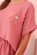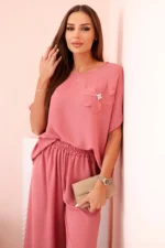Komplet damski z wiskozy z ozdobnym kwiatem i szerokimi spodniami ciemny różowy