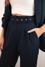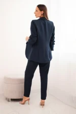 Prezentujemy Państwu elegancki komplet marynarki i spodni. Marynarka bez zapięcia z klapami z przodu. Marynarka posiada podszewkę. Spodnie z kieszeniami oraz paskiem. W pasie spodni z tyłu wszyta elastyczna taśma. Bardzo modny i stylowy komplet. Komplet wykonany jest z wysokiej jakości materiału. Rozmiar jest uniwersalny i będzie odpowiedni dla Pań w rozmiarze S, M lub L.