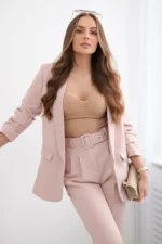 Prezentujemy Państwu elegancki komplet marynarki i spodni. Marynarka bez zapięcia z klapami z przodu. Marynarka posiada podszewkę. Spodnie z kieszeniami oraz paskiem. W pasie spodni z tyłu wszyta elastyczna taśma. Bardzo modny i stylowy komplet. Komplet wykonany jest z wysokiej jakości materiału. Rozmiar jest uniwersalny i będzie odpowiedni dla Pań w rozmiarze S, M lub L.