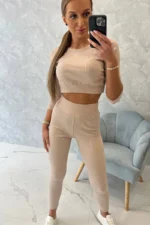 Prezentujemy Państwu komplet bluzki z legginsami. Bluzka oraz legginsy wykonane są z prążkowanego materiału. Komplet wykonany jest z wysokiej jakości materiału. Rozmiar jest uniwersalny i będzie odpowiedni dla Pań w rozmiarze XS, S.