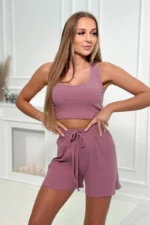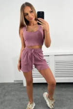 Prezentujemy Państwu komplet topu z szortami. Bluzka na ramiączka. Bluzka oraz szorty wykonane są z prążkowanego materiału. Komplet wykonany jest z wysokiej jakości materiału. Rozmiar jest uniwersalny i będzie odpowiedni dla Pań w rozmiarze XS, S.