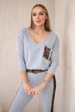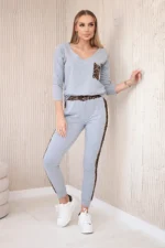 Prezentujemy Państwu komplet bluzki i spodni. Komplet posiada wstawki z motywem panterki. Bluzka z przodu z naszytą kieszonką. Spodnie posiadają kieszenie. Komplet wykonany jest z wysokiej jakości materiału. Rozmiar jest uniwersalny i będzie odpowiedni dla Pań noszących rozmiar S, M lub L.