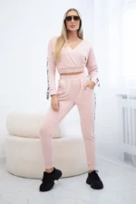 Prezentujemy Państwu komplet bluzy i spodni. Bluza oraz spodnie posiadają ozdobną taśmę z napisem. U dołu bluzy znajduje się wszyta guma. Spodnie z kieszeniami. Bardzo modny i stylowy komplet. Komplet wykonany jest z wysokiej jakości materiału. Rozmiar jest uniwersalny i będzie odpowiedni dla Pań w rozmiarze S, M lub L.