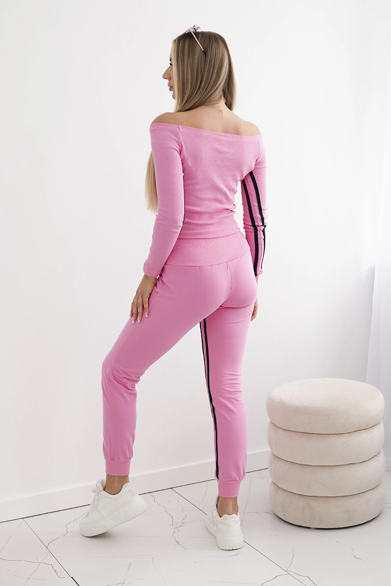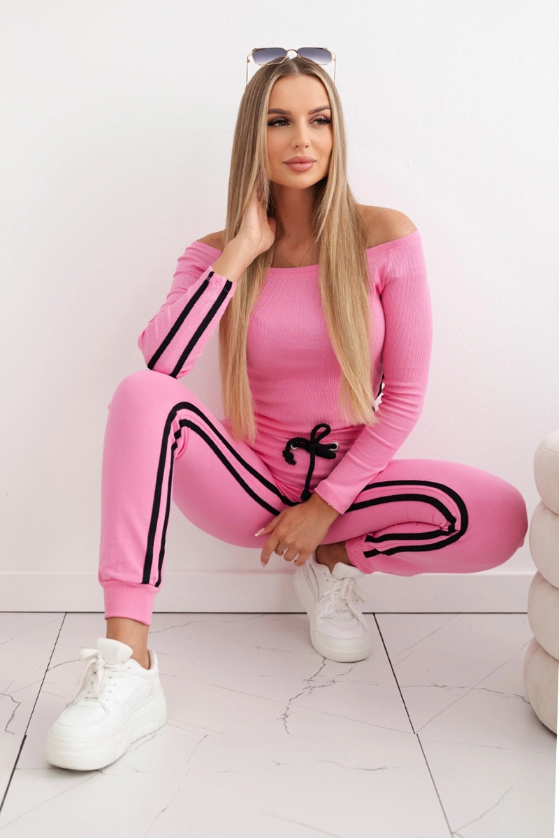 Prezentujemy Państwu komplet bluzy i spodni. Komplet posiada spodnie z wyższym stanem. Bluzka z prążkowanego materiału. Na spodniach naszyty podwójny lampas oraz na bluzce. Spodnie posiadają kieszenie. Komplet wykonany jest z wysokiej jakości materiału. Rozmiar jest uniwersalny i będzie odpowiedni dla Pań noszących rozmiar S, M lub L.