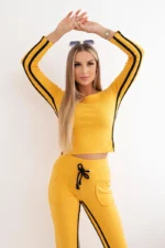 Prezentujemy Państwu komplet bluzy i spodni. Komplet posiada spodnie z wyższym stanem. Bluzka z prążkowanego materiału. Na spodniach naszyty podwójny lampas oraz na bluzce. Spodnie posiadają kieszenie. Komplet wykonany jest z wysokiej jakości materiału. Rozmiar jest uniwersalny i będzie odpowiedni dla Pań noszących rozmiar S, M lub L.