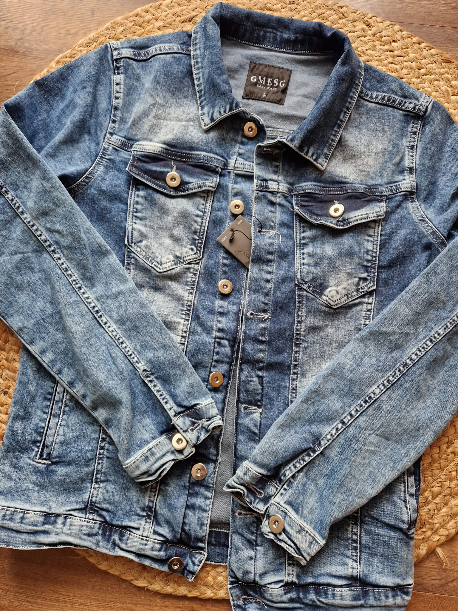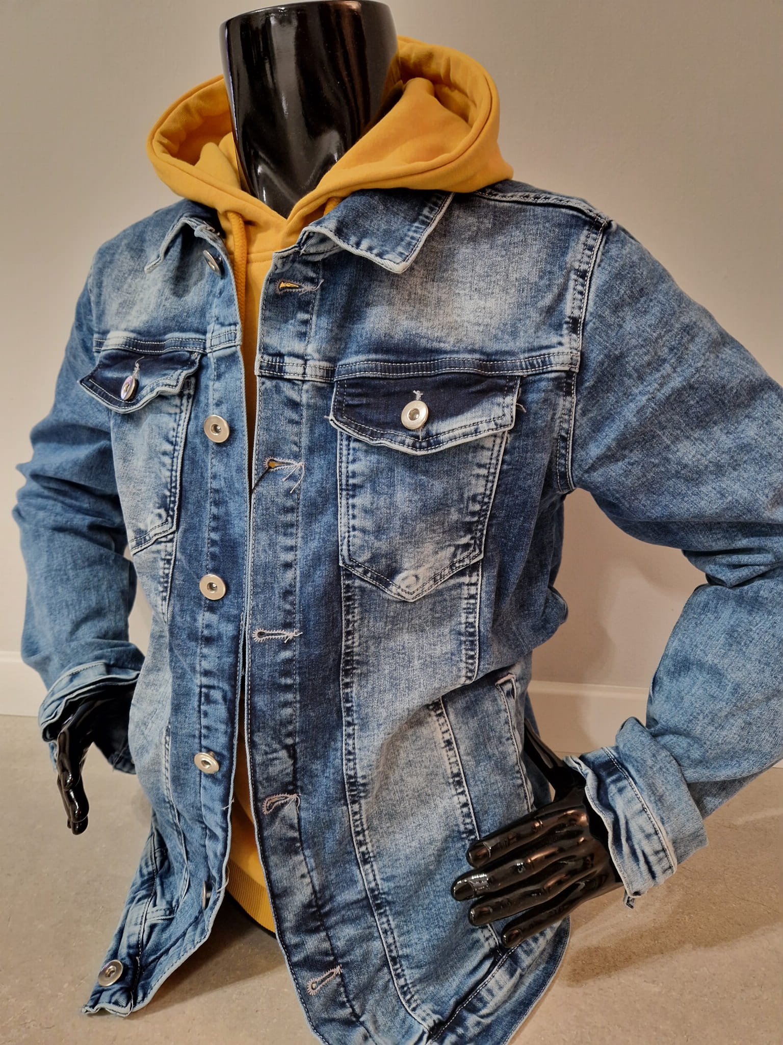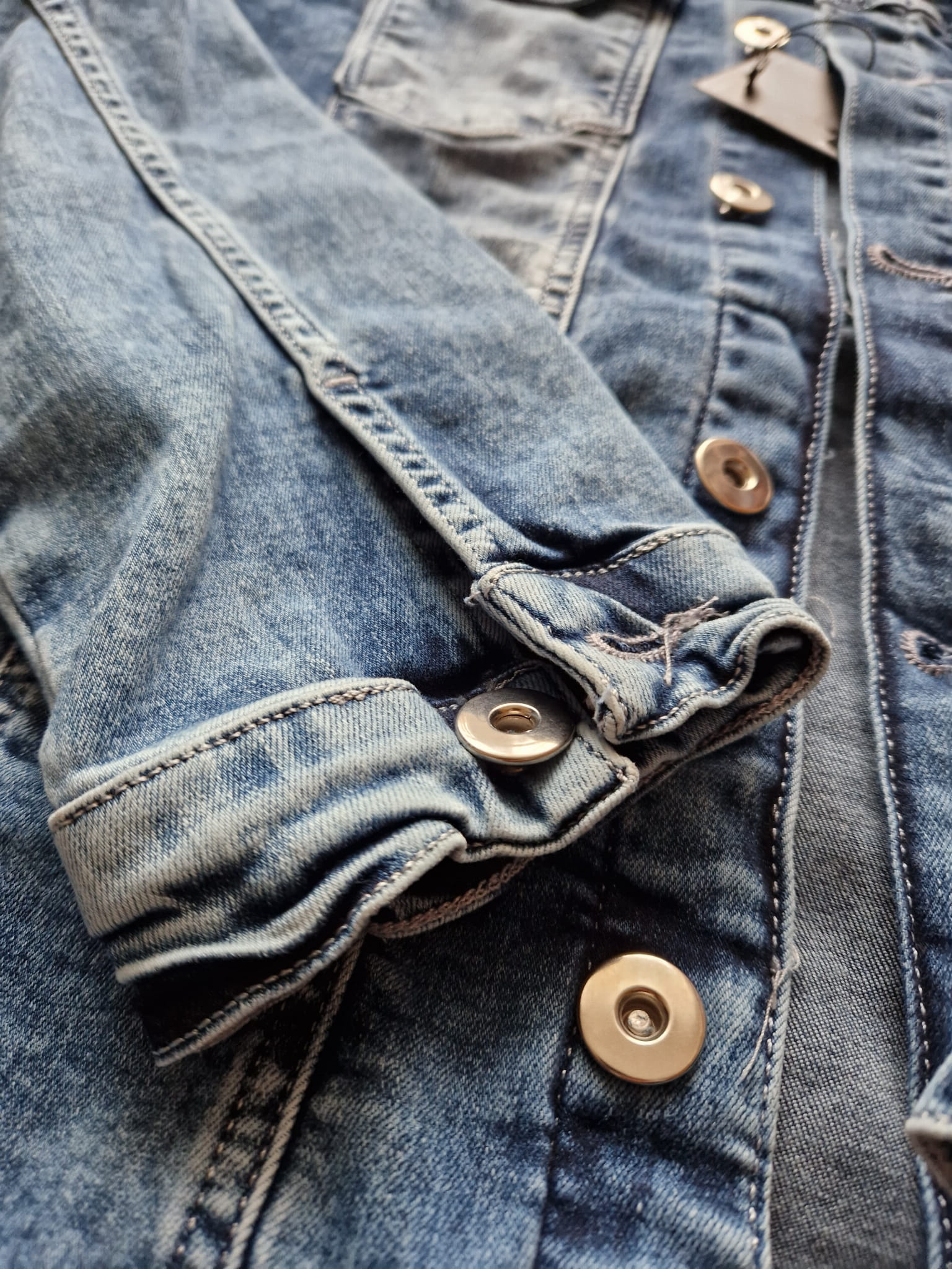 Męska kurtka jeansowa Klasyczna jeansowa kurtka zapinana na guziki, niezwykle komfortowa podczas noszenia. Posiada dwie naszywane kieszenie na piersiach oraz dwie boczne. Mankiety z guzikami umożliwiają dowolne podwijanie rękawów, a pasek z guzikami regulację szerokości dołu kurtki. Kurtka w różnych stylizacjach doskonale sprawdzi się w okresie przejściowym oraz letnie chłodniejsze poranki I wieczory. Materiał: 73,5% bawełna 25,6 poliester 0,9 elastan Rozmiary: M szerokość pod pachami 54cm, długość całkowita 68cm, długość rękawa: 67cm,L szerokość pod pachami 55cm, długość całkowita 70cm, długość rękawa:69cm,XL szerokość pod pachami 58cm, długość całkowita 71cm, długość rękawa: 69cm, XXL szerokość pod pachami 60cm, długość całkowita 72cm, długość rękawa: 71cm. 3XL szerokość pod pachami 62cm, długość całkowita 74cm, długość rękawa: 70cm.