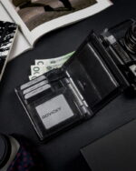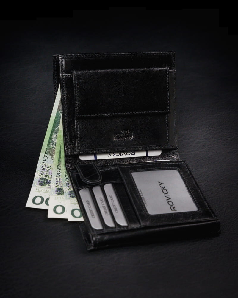 Wyposażony w technologię RFID STOP, która chroni portfel przed złodziejami używającymi czytniku do kart.