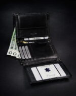 Na portfelu są tłoczenia poświadczające, że jest chroniony przez system RFID oraz to, że jest uszyty ze skóry naturalnej. Wewnątrz znajdują się wkładki ochronne, które chronią portfel przed odgniataniem się podczas podróży do Twoich rąk własnych :)