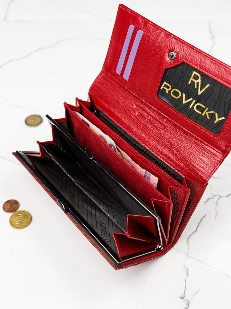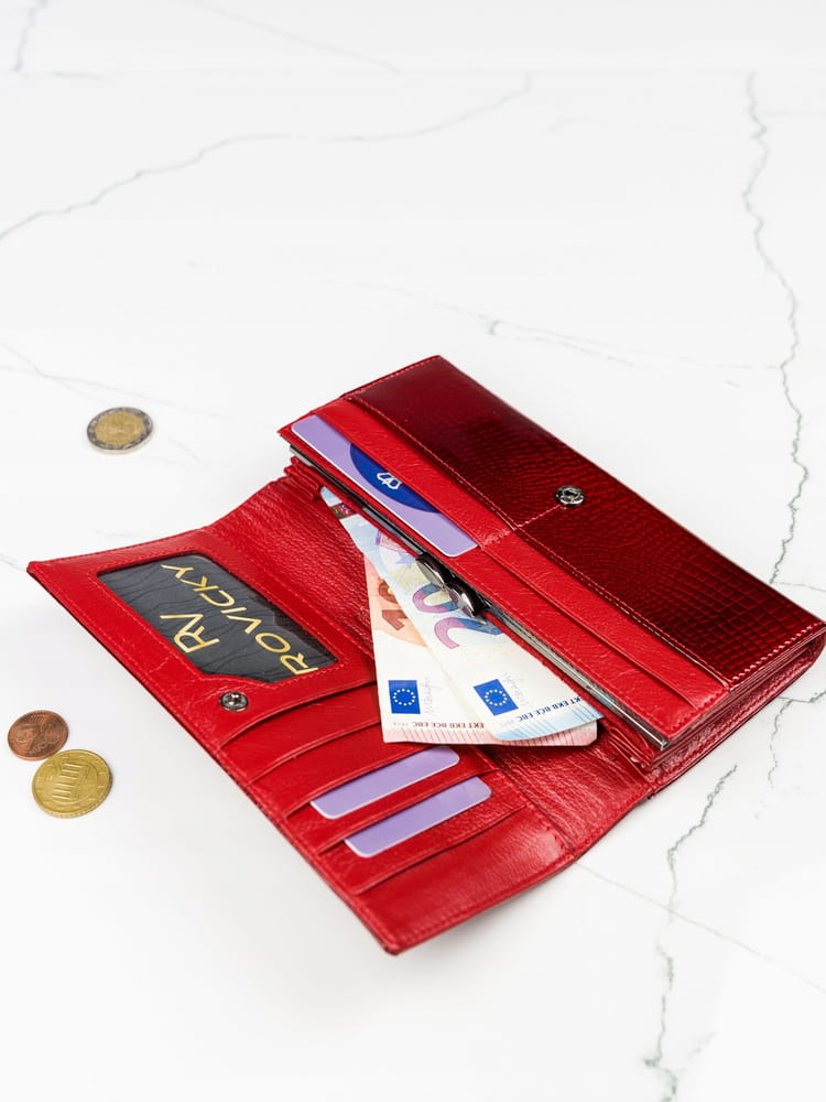 - 2 kieszenie na dokumenty. Jedna mieści się wewnątrz, schowana pod przegródkami na karty i miejscem na fotografię. Druga jest po zewnętrznej stronie. Zalecamy jednak, by ważne dokumenty przechowywać wewnątrz, zapinanego zatrzaskiem portfela.