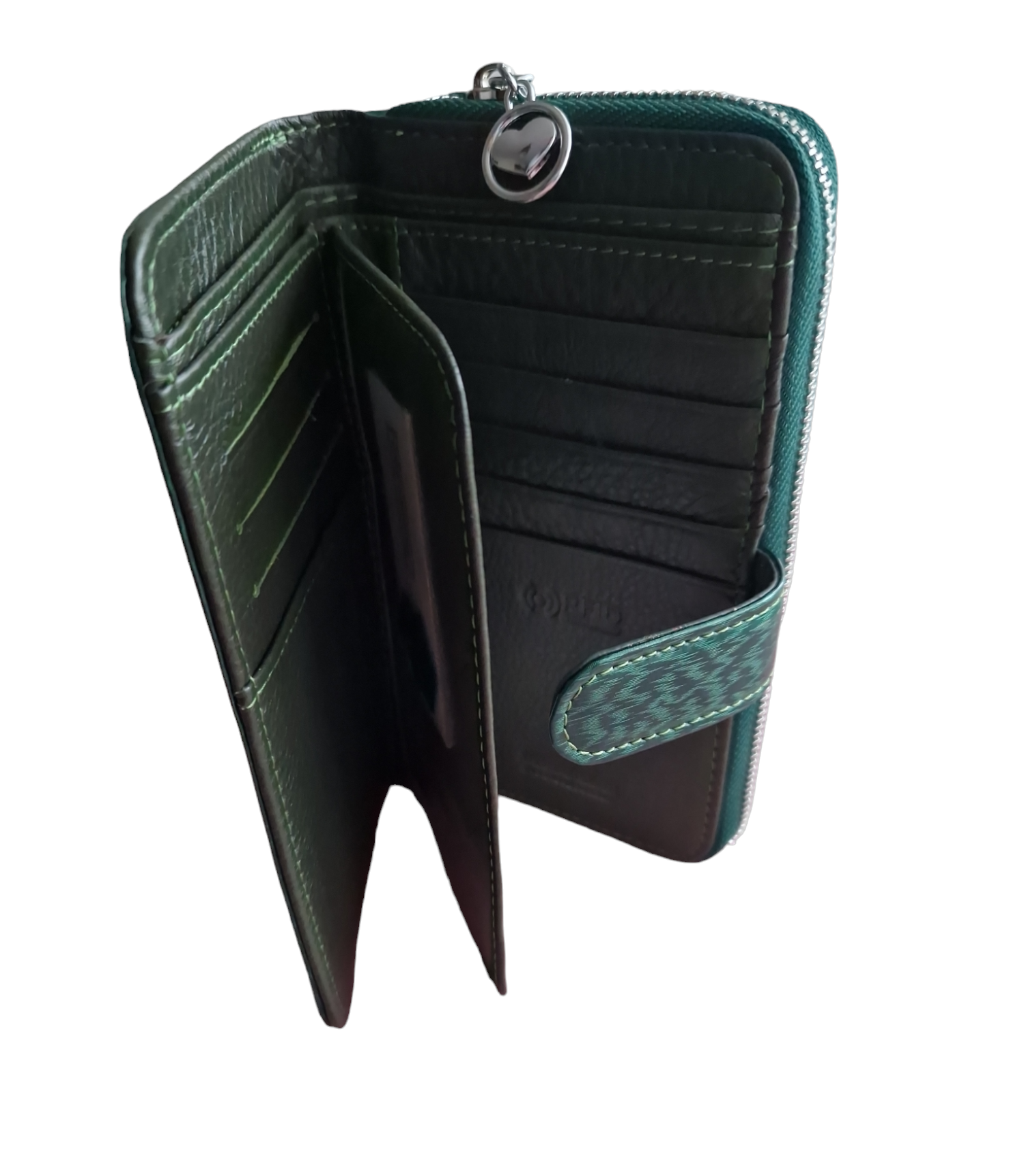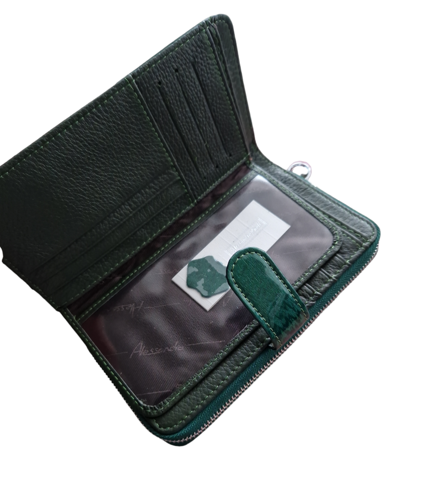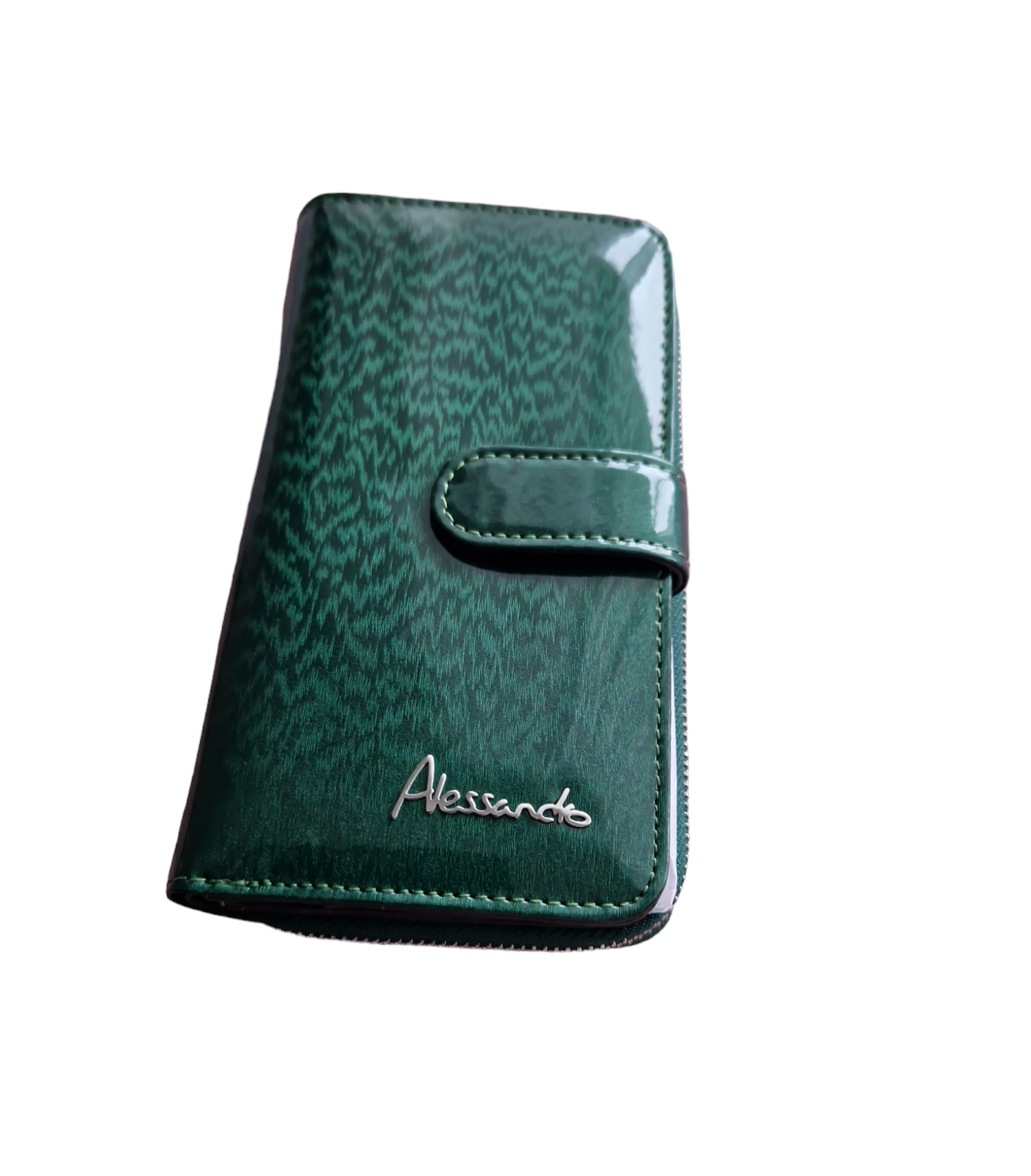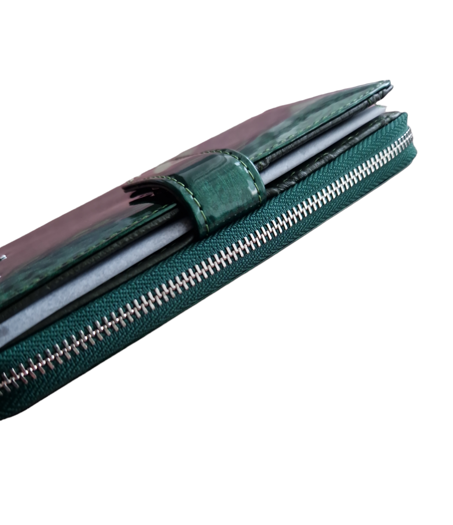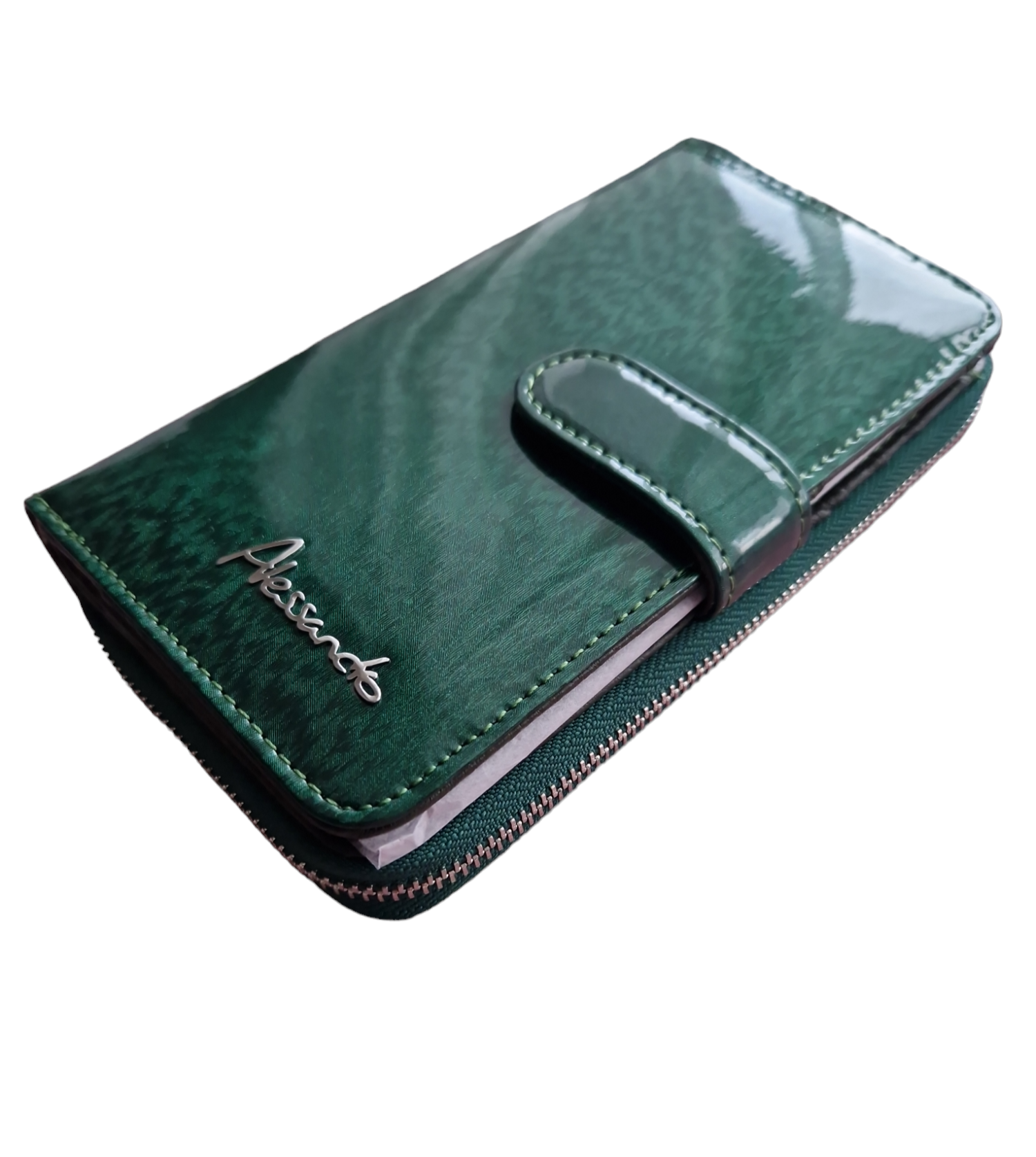 Zielony kolor jest uniwersalny i pasuje do każdego stroju. Lakierowana skóra dodaje portfelowi elegancji i charakteru.