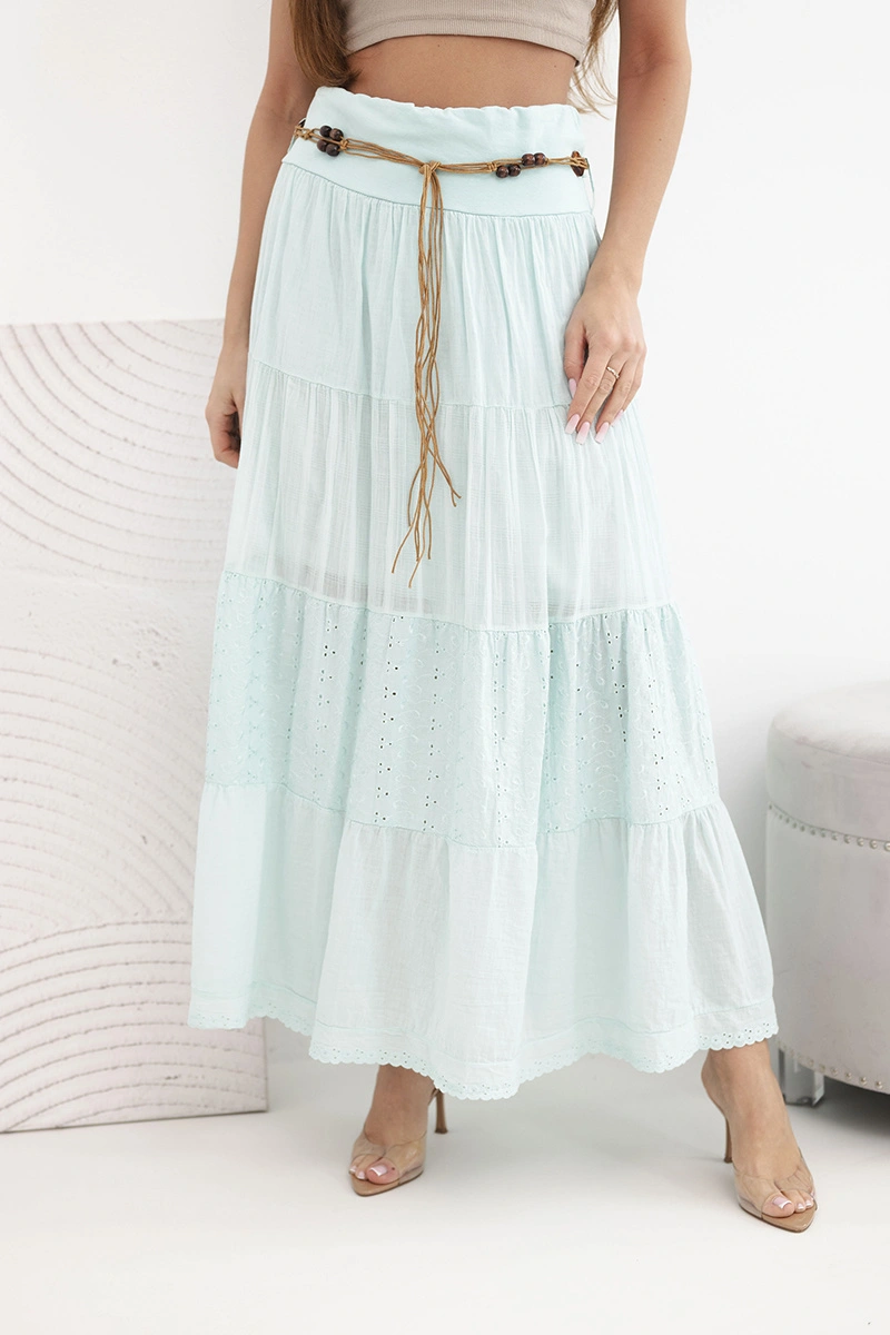 To idealna spódnica damska na wiosnę, lato oraz na wakacyjne wyjazdy. Świetnie komponuje się zarówno z prostym topem, jak i luźną bluzką czy lekkim swetrem. Ozdobne przeszycia oraz ażurowa wstawka dodają jej subtelnego uroku, a elastyczny pas zapewnia dobre dopasowanie do sylwetki. Dodatkowym atutem jest dekoracyjny pasek, który podkreśla styl boho i nadaje całości modnego wykończenia. Produkcja Włoska gwarantuje staranne wykonanie oraz modny design inspirowany najnowszymi trendami.