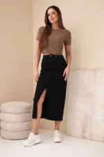 Model ten doskonale sprawdzi się z dopasowaną koszulką, oversize’owym swetrem lub elegancką bluzką – wystarczy zmienić dodatki, by nadać całości innego charakteru. Elastyczny materiał z dodatkiem poliestru i elastanu zapewnia komfort noszenia oraz swobodę ruchów. Zapięcie na guzik i zamek oraz klasyczne kieszenie z przodu i z tyłu nadają spódnicy funkcjonalności.