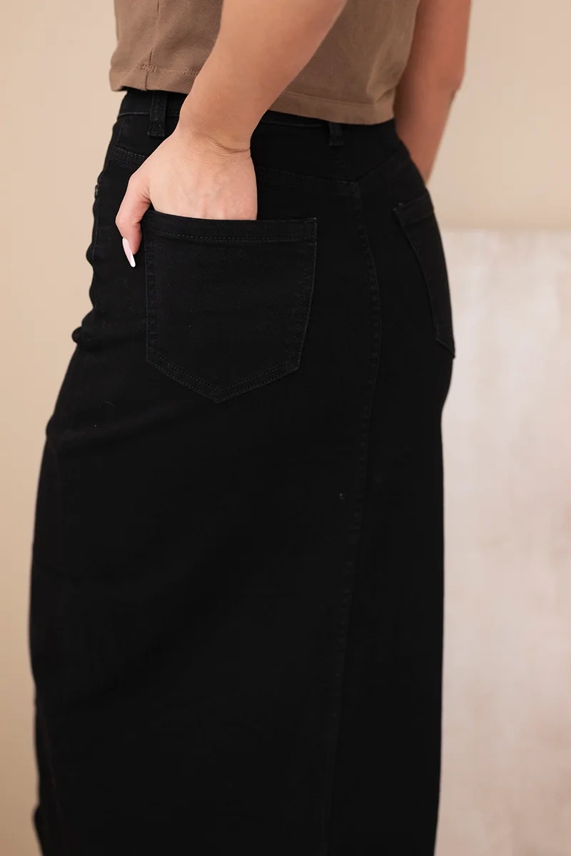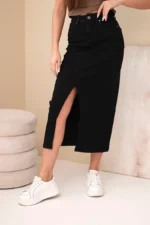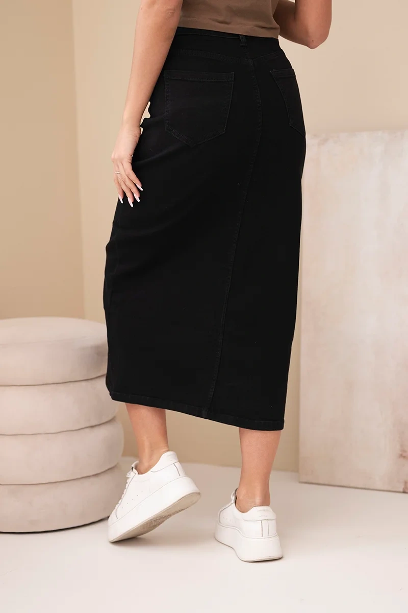 Ta spódnica jeansowa damska z wysokim stanem to stylowa propozycja dla kobiet, które cenią klasyczne kroje i wygodę na co dzień. Fason o długości midi pięknie modeluje sylwetkę, podkreślając talię oraz biodra. Ciemny, jednolity denim dodaje elegancji, a jednocześnie sprawia, że spódnica jest niezwykle uniwersalna – idealna zarówno do casualowych stylizacji, jak i bardziej kobiecych zestawów.