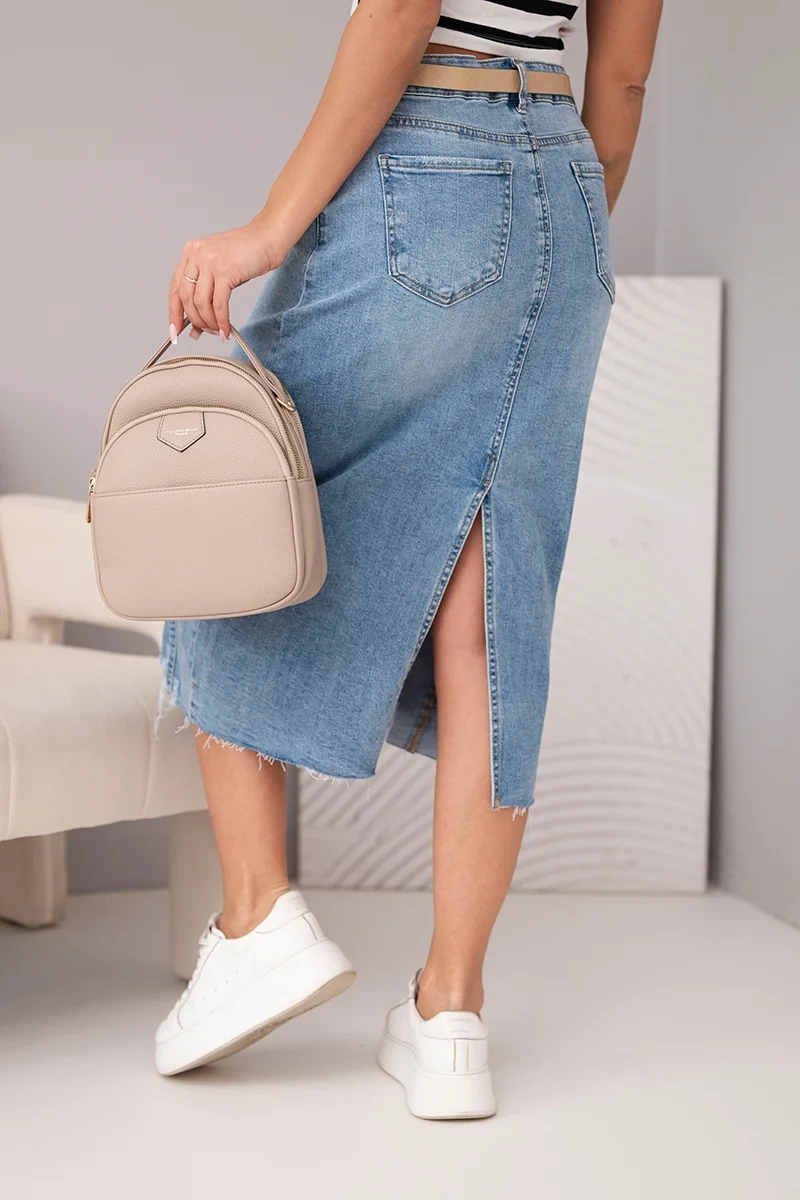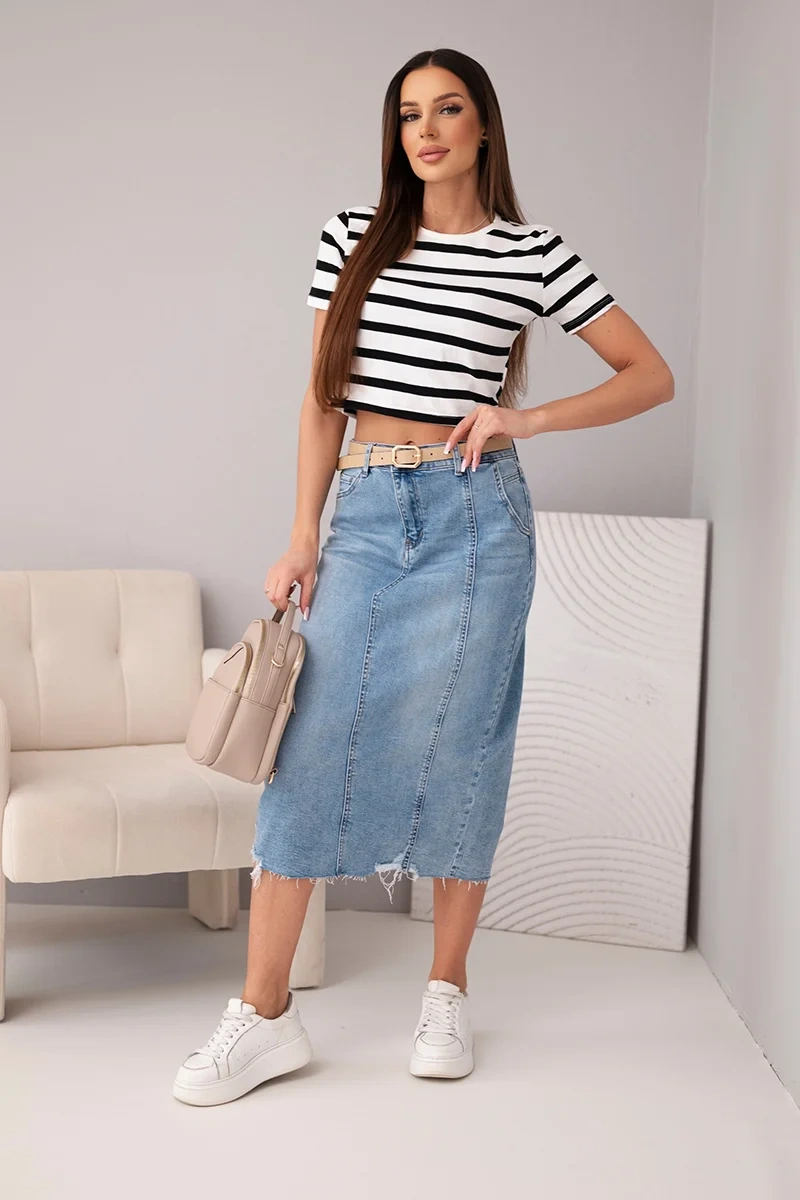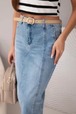 Jeansowa spódnica M.Sara model ME501-4 to klasyczna propozycja w stylu casual z modnym paskiem i surowym wykończeniem u dołu. Zapinana na zamek i guzik, wyposażona w praktyczne kieszenie i subtelny rozporek z przodu. Idealna na co dzień i do pracy – łączy wygodę z kobiecym fasonem.
