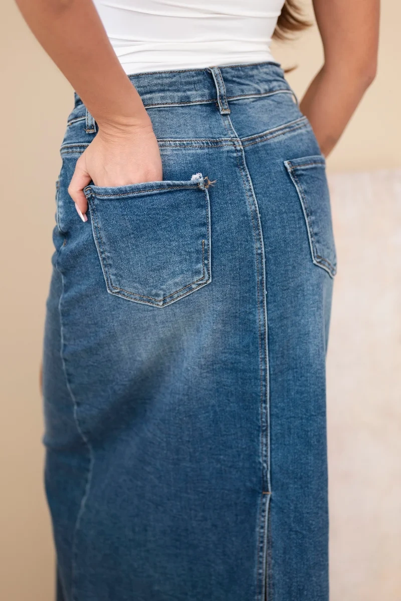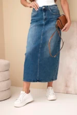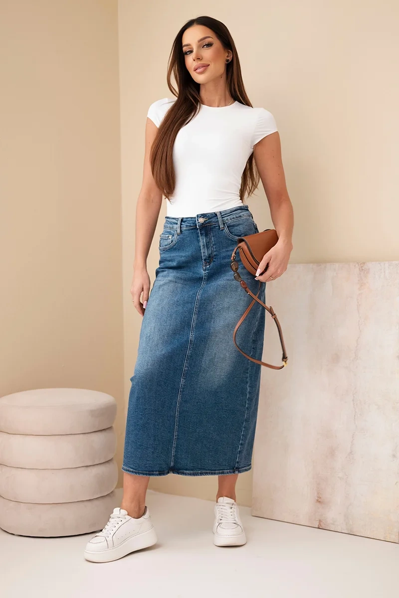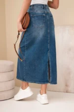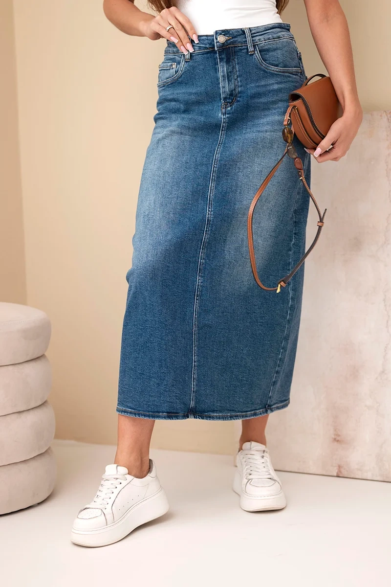 Klasyczna jeansowa spódnica midi M.Sara model ME388 to idealna propozycja dla kobiet ceniących prostotę, komfort i ponadczasowy styl. Wysoki stan pięknie podkreśla talię, a długość midi nadaje całości elegancji i subtelności.