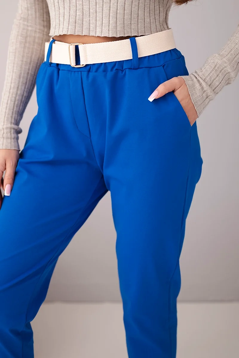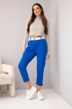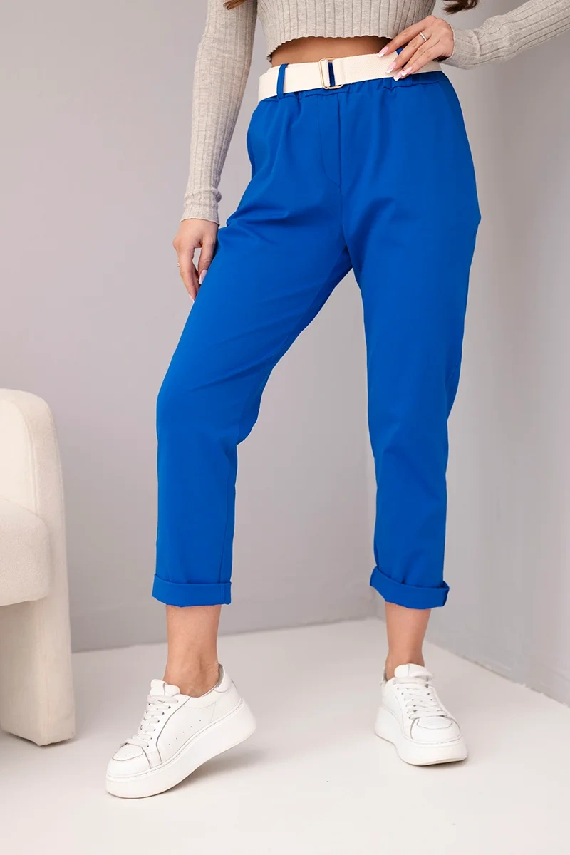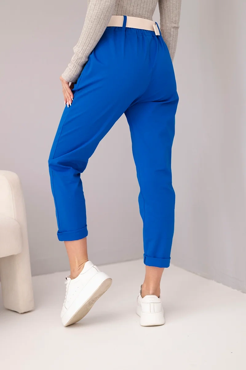 Spodnie damskie bawełniane z paskiem i podwijaną nogawką chabrowe