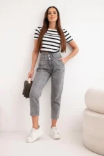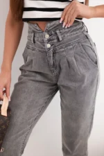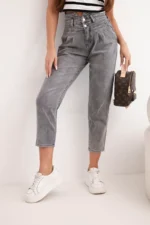 Te stylowe jeansy damskie z wysokim stanem i podwójnym zapięciem to doskonała propozycja dla kobiet, które cenią modny wygląd i wygodę na co dzień. Fason typu paperbag z delikatnymi marszczeniami w talii pięknie podkreśla sylwetkę, a lekko zwężane nogawki optycznie wysmuklają nogi.