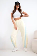 Elastyczna talia gwarantuje wygodne dopasowanie, a luźniejszy fason zapewnia swobodę ruchów. Modne lampasy po bokach nogawek nadają całości sportowego charakteru i optycznie wysmuklają sylwetkę. Spodnie świetnie sprawdzą się w codziennych stylizacjach – zarówno w połączeniu z t-shirtem, bluzą czy sneakersami.